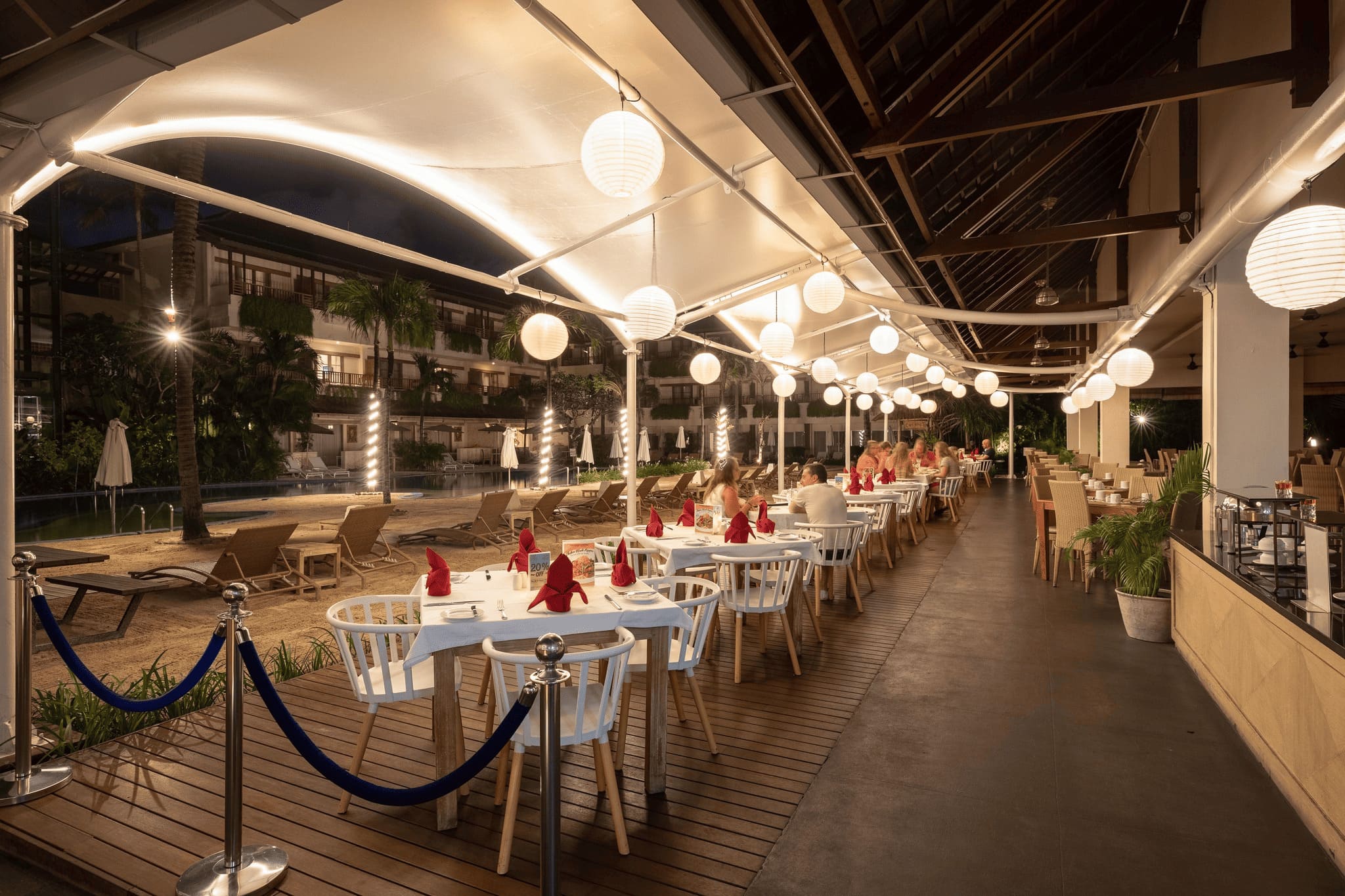 Poolside dining with mix of Western and Balinese cuisine.